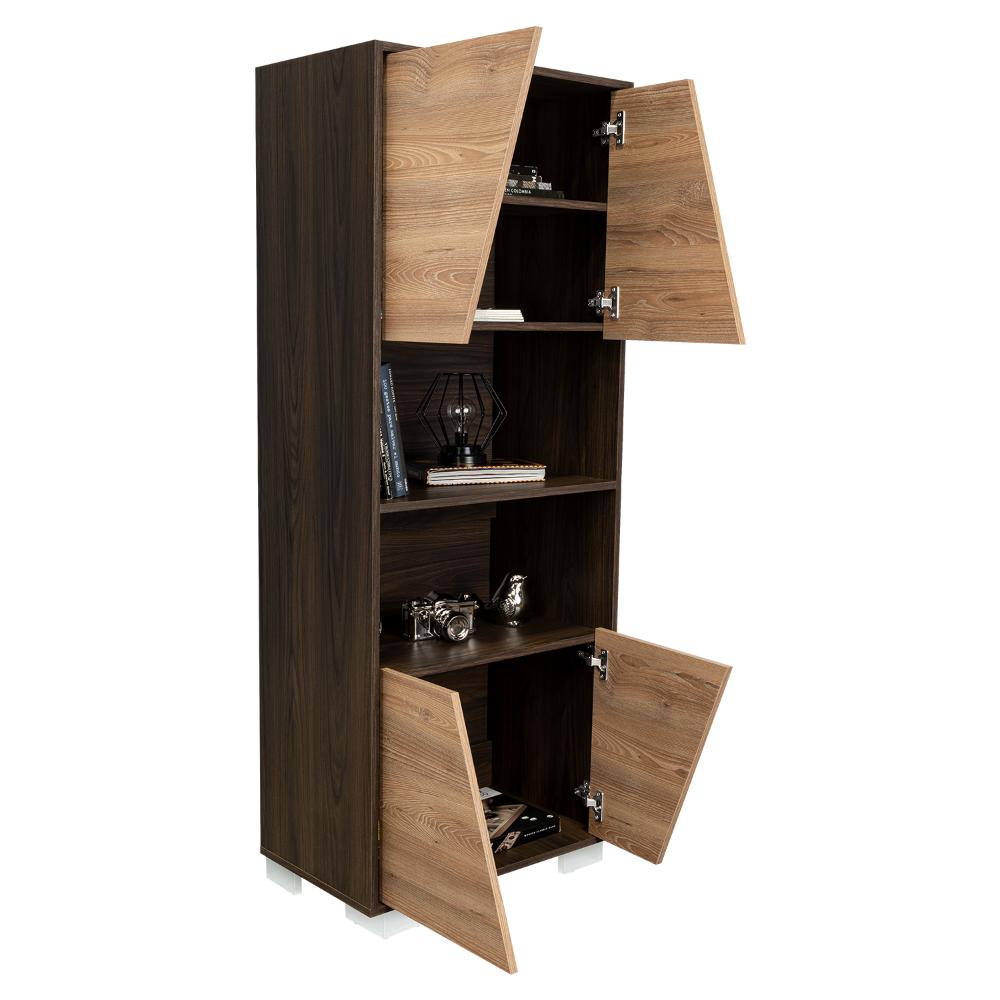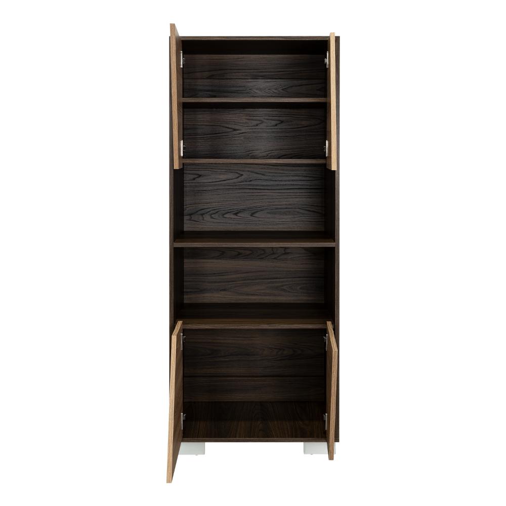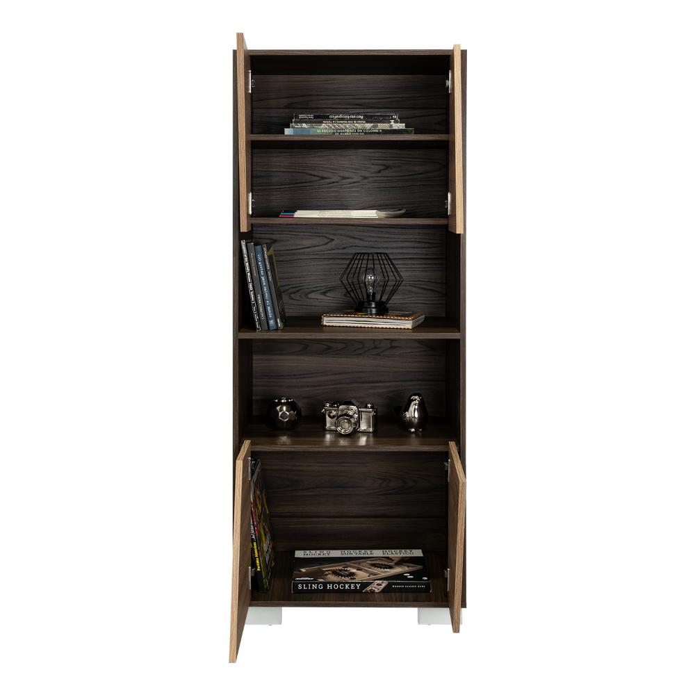 Biblioteca, con 4 puertas batientes, 5 entrepaños para ubicar objetos y patas metálicas.