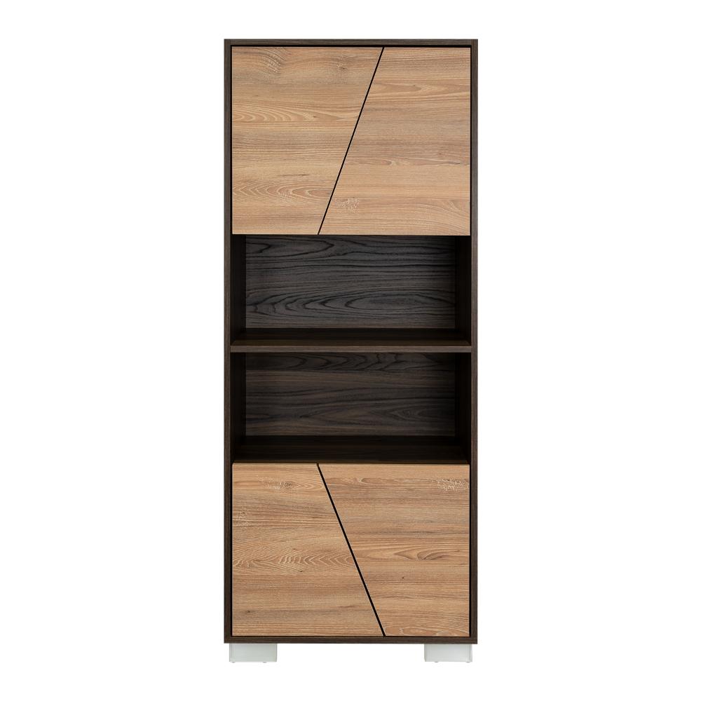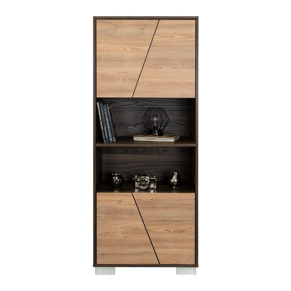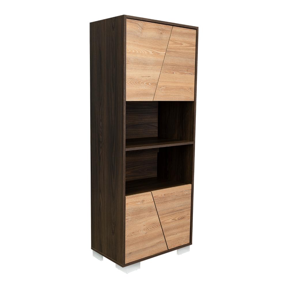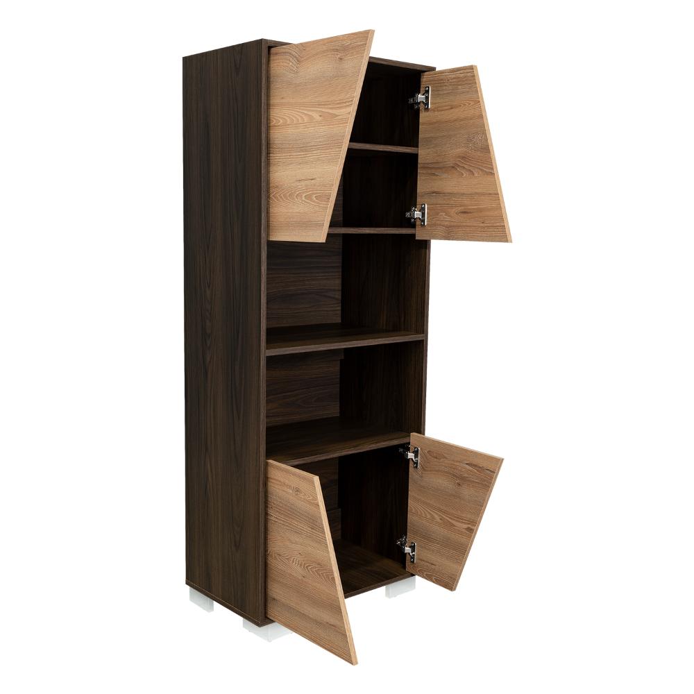 Biblioteca, con 4 puertas batientes, 5 entrepaños para ubicar objetos y patas metálicas.