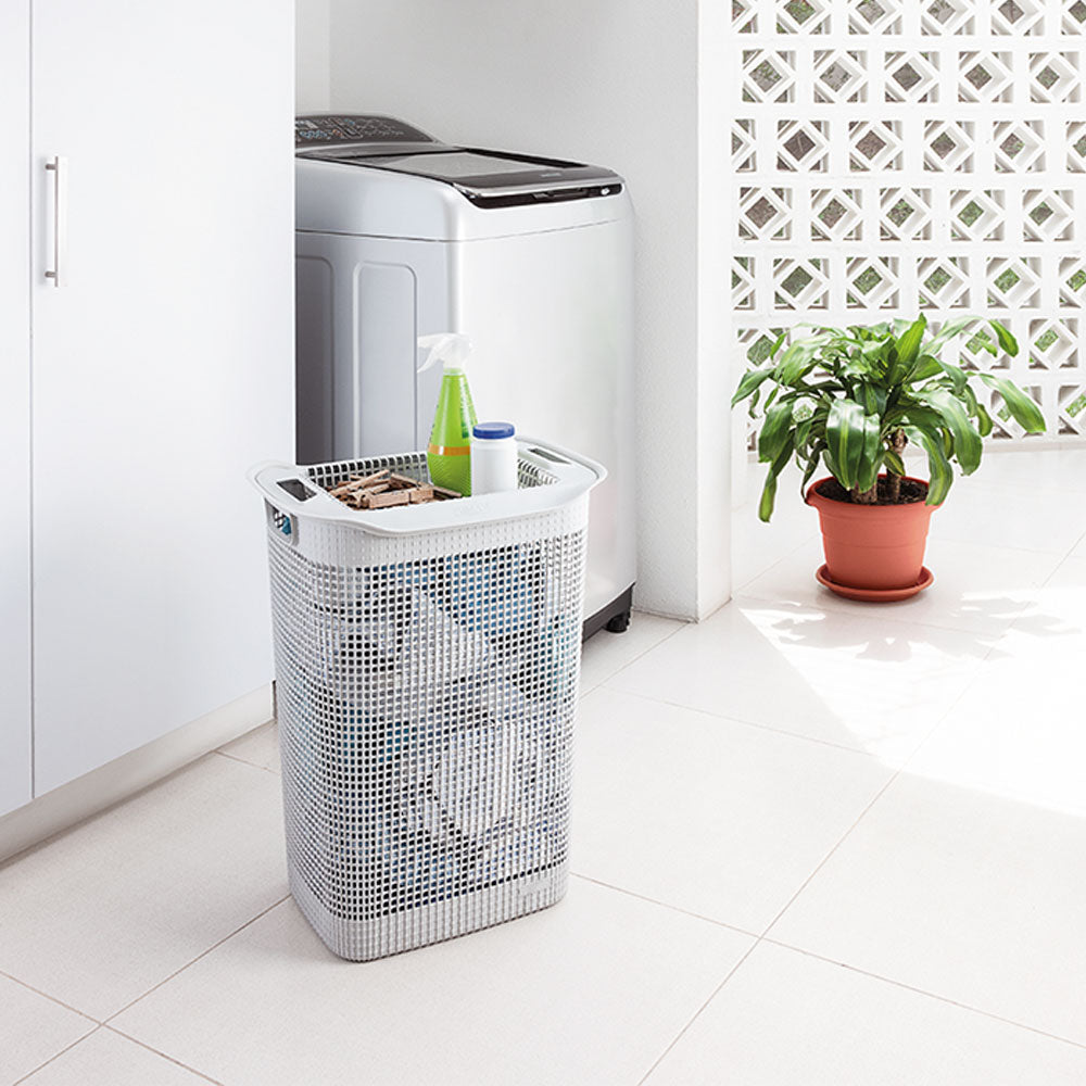 Cesta para Ropa Linum con tejido imitación lino y textura mate. Tapa con espacio para organizar accesorios o prendas pequeñas. Manijas ergonómicas y capacidad de 51 litros. Los colores de vanguardia que van con el estilo de tu hogar.