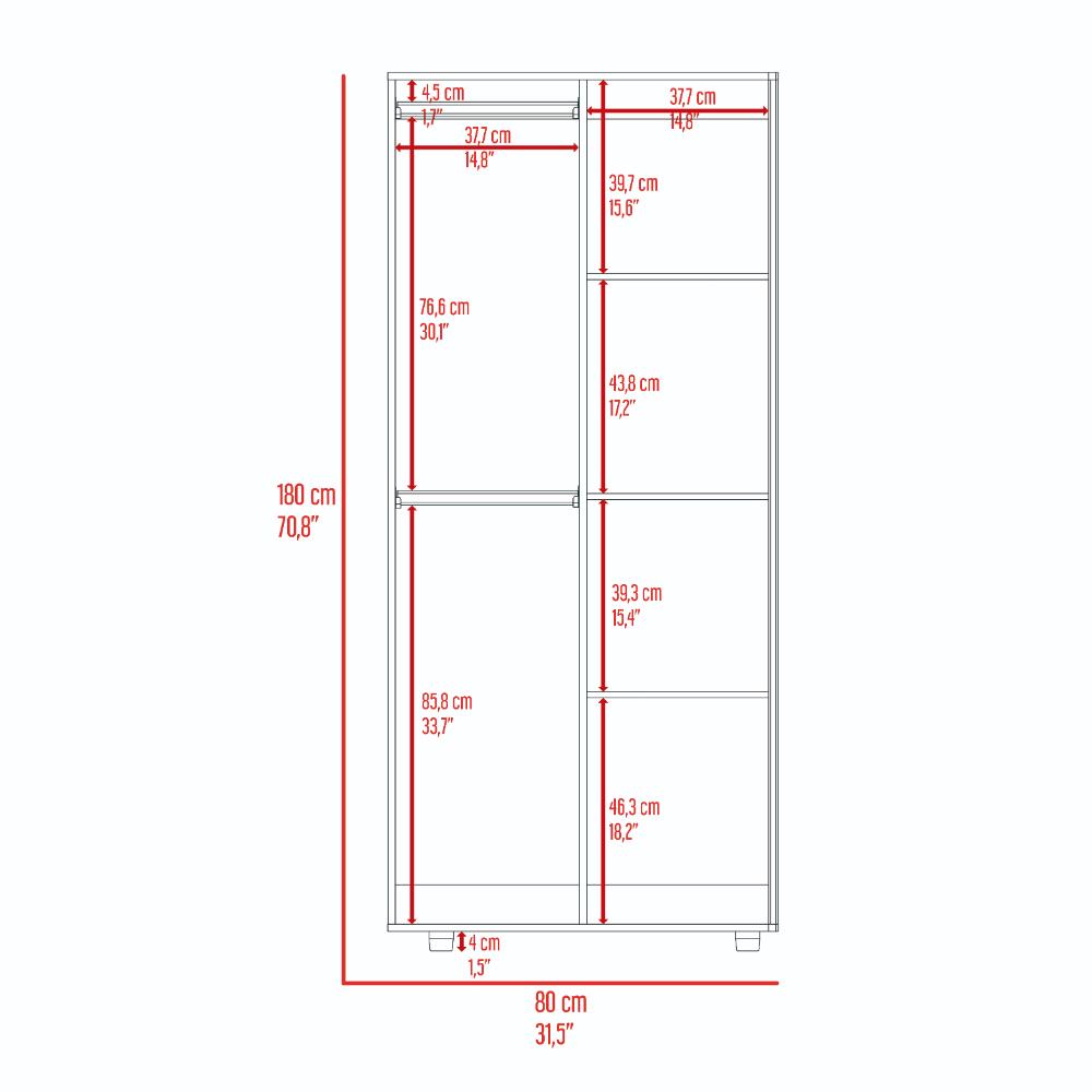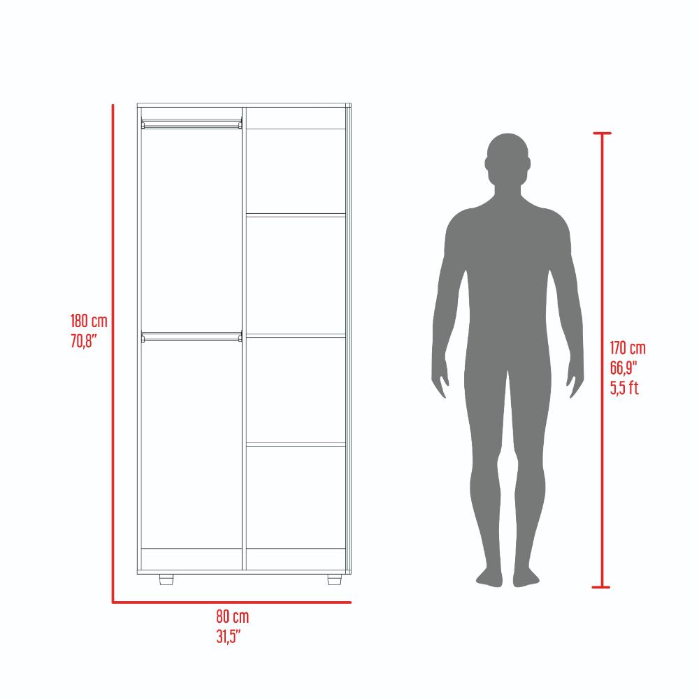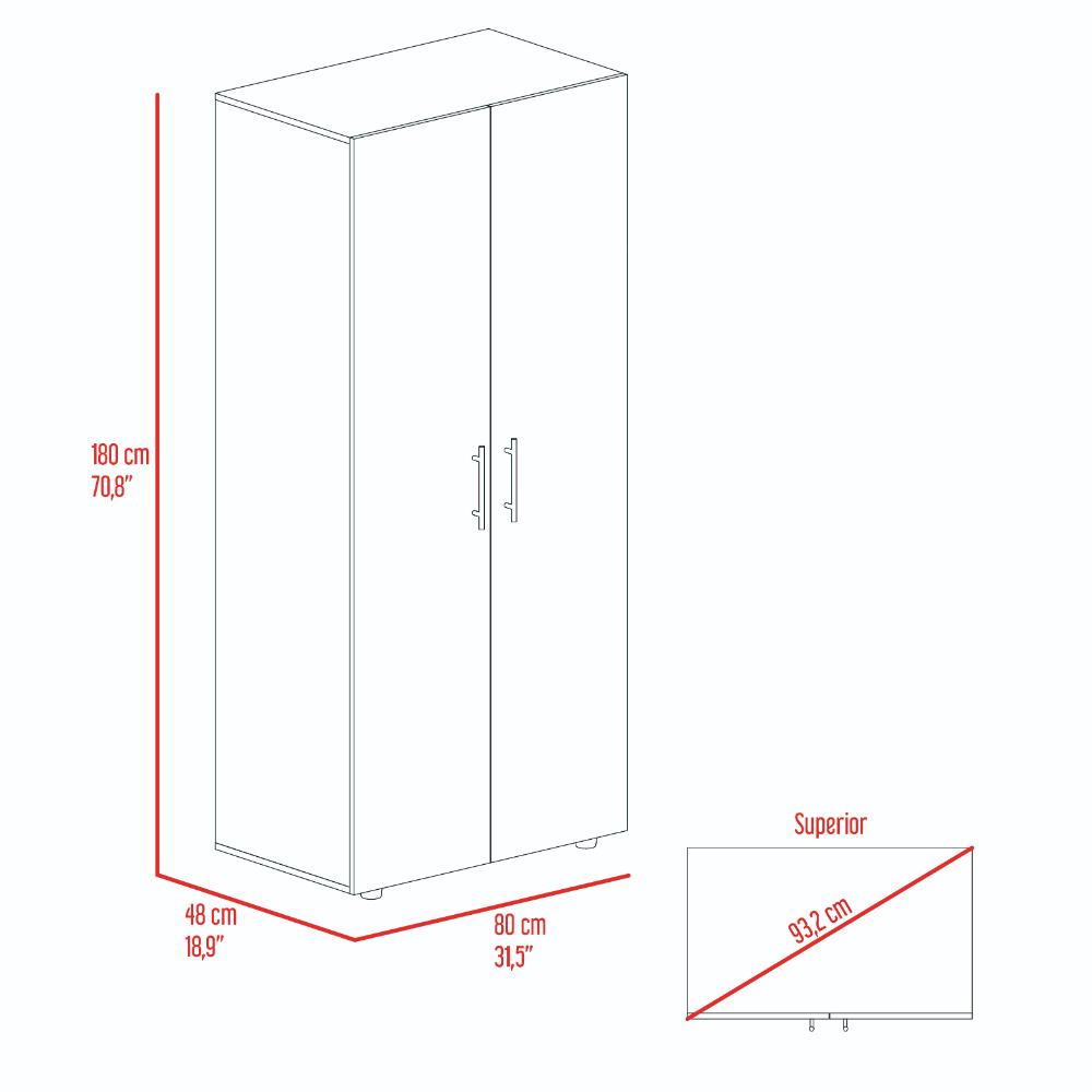 Closet, con 2 puertas abatibles, 2 tubos para colgar prendas, y entrepaños para organizar.