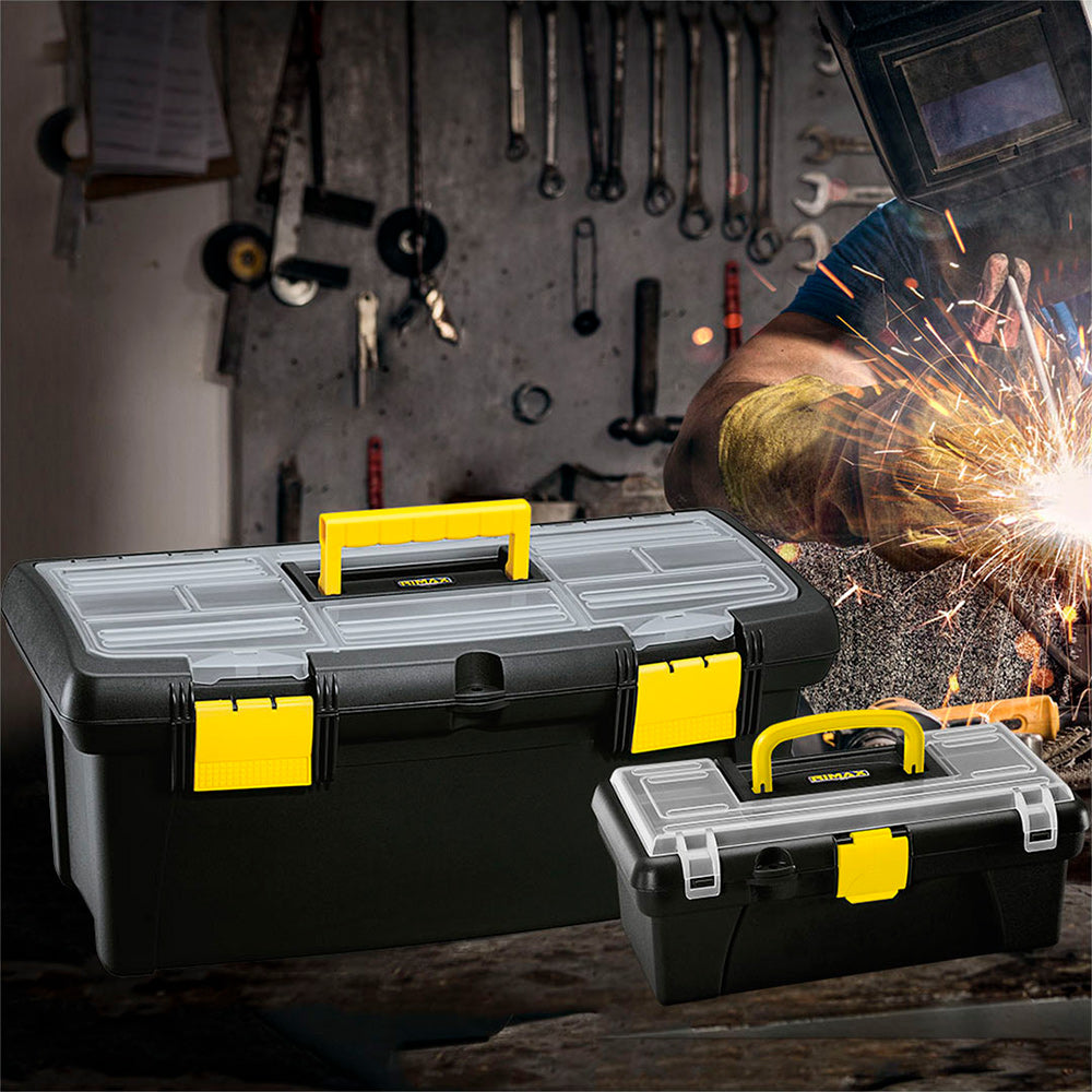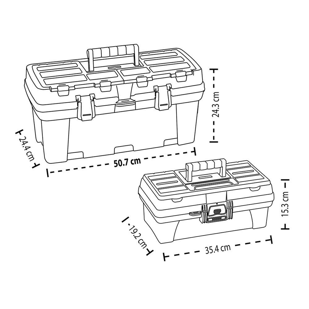 Combo de cajas de herramienta de 22 y 12 pulgadas. con capacidad de 20 y 3 litros respectivamente. La caja de 22" tiene una resistencia de 40 kg de peso mientras la de 12" resiste 5 kg. Ideal para aquellas personas que desean tener dos alternativas de transporte de herramientas, la de 22 pulgadas para trabajo pesado, mientras la de 12 pulgadas para transportar implementos esenciales de tamaño pequeño