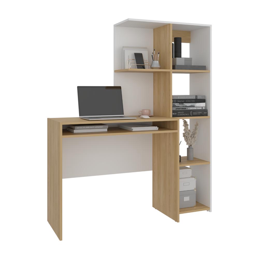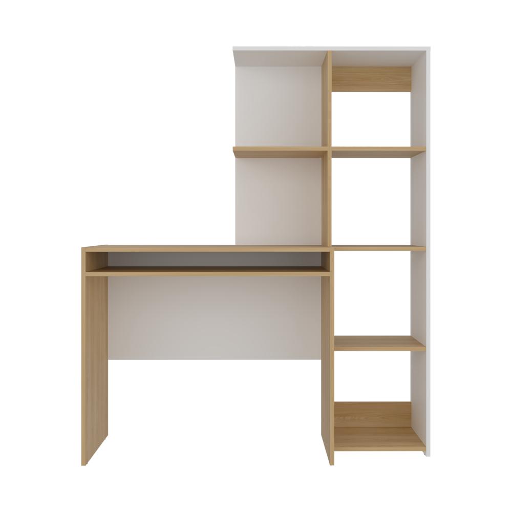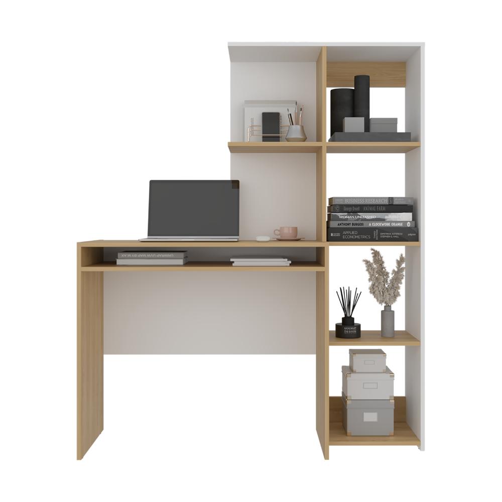 Escritorio Biblioteca Alister, Blanco Duqueza y Fresno Europeo, con multiples entrepaños y superficies para ubicar objetos