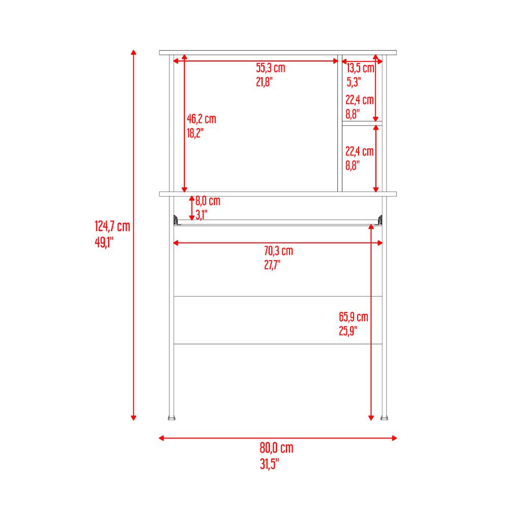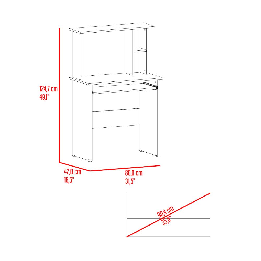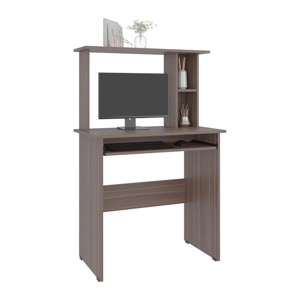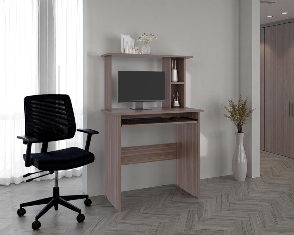 Escritorio, con amplio espacio para computador, entrepaños para colocar libros u objetos, badeja movil para teclado, es de facil instalación