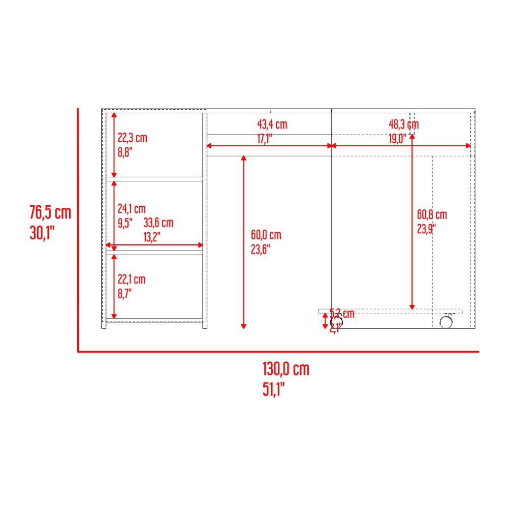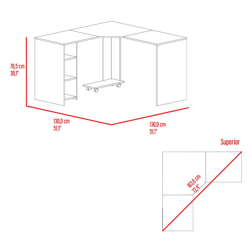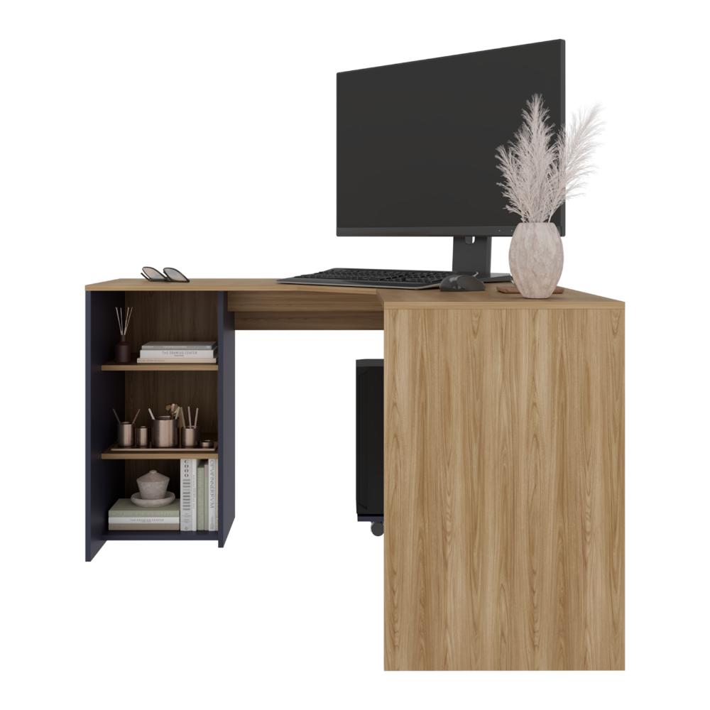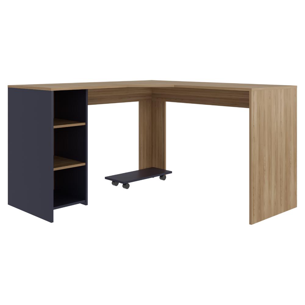 Escritorio En L Dafne, Fresno Europeo y Azul Kronos , con Dos Entrepaños y Base con Rodachinas Para Fácil Desplazamiento