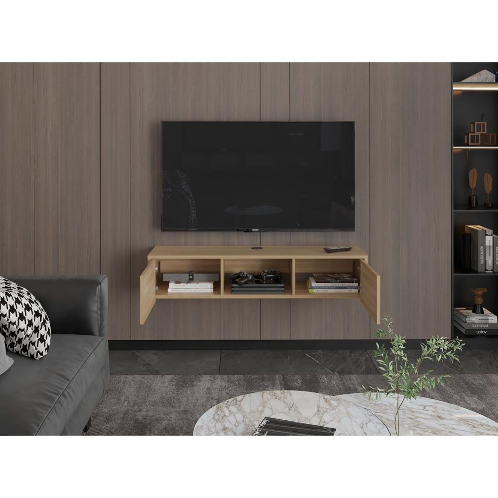 Mesa de TV Flotante, con superficie para objetos decorativos, equipos de audio y video, y dos puertas abatibles