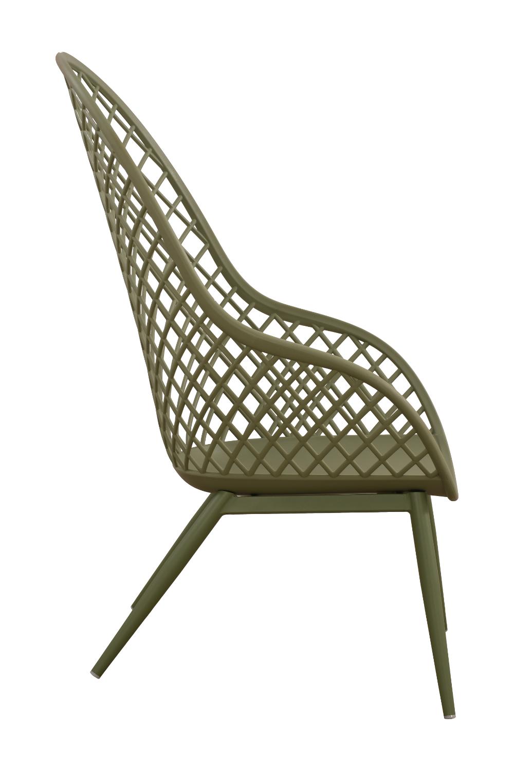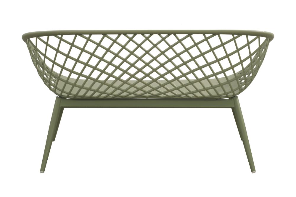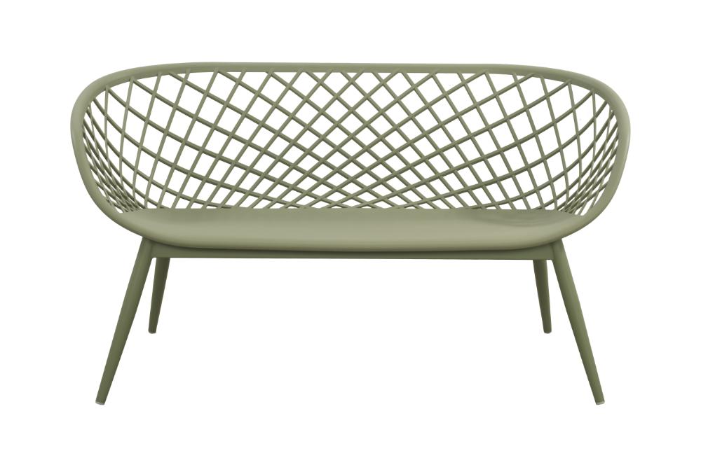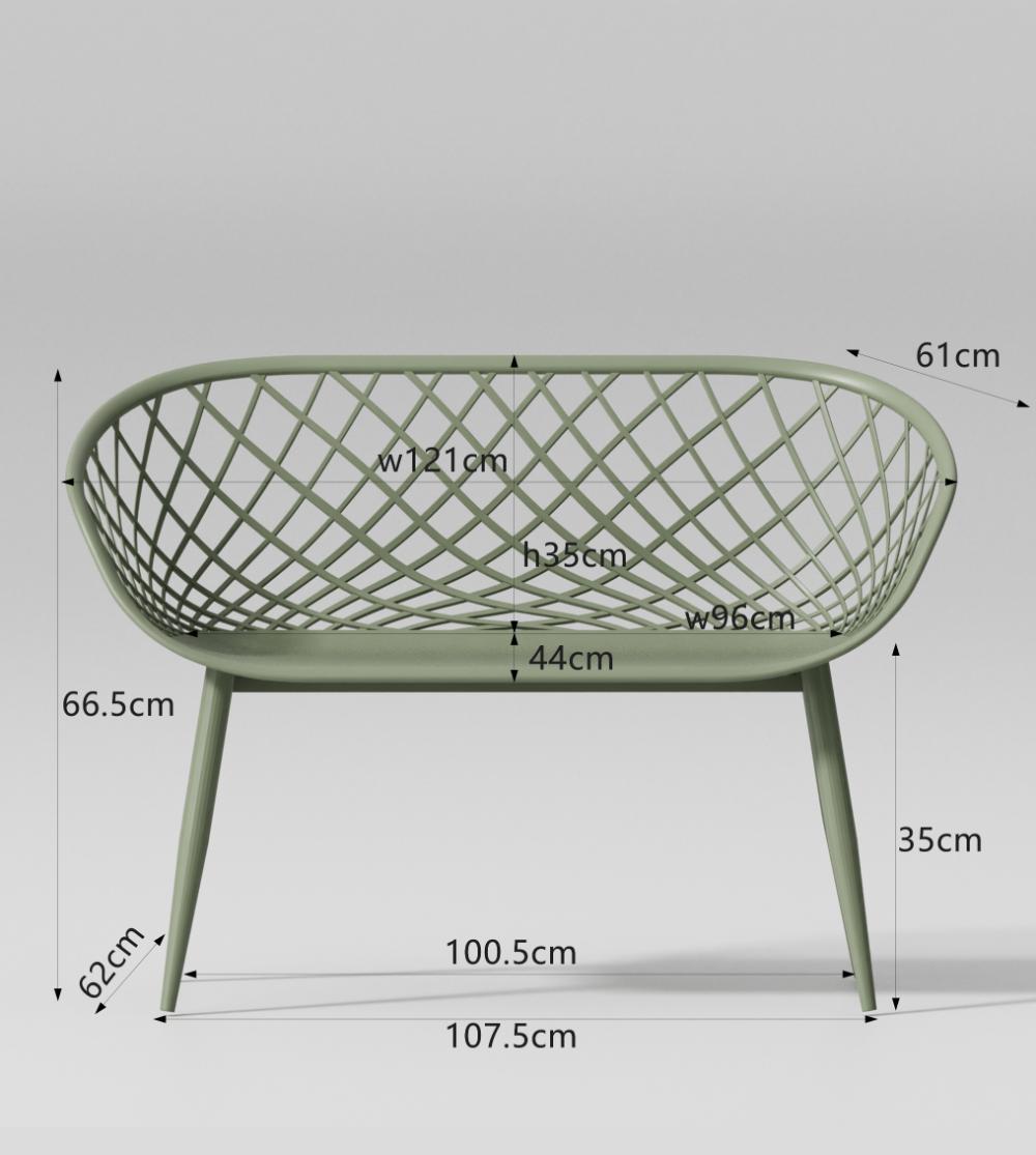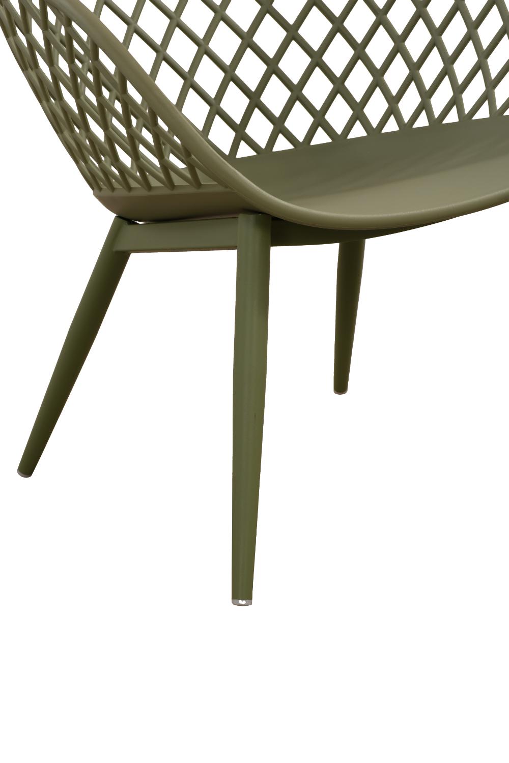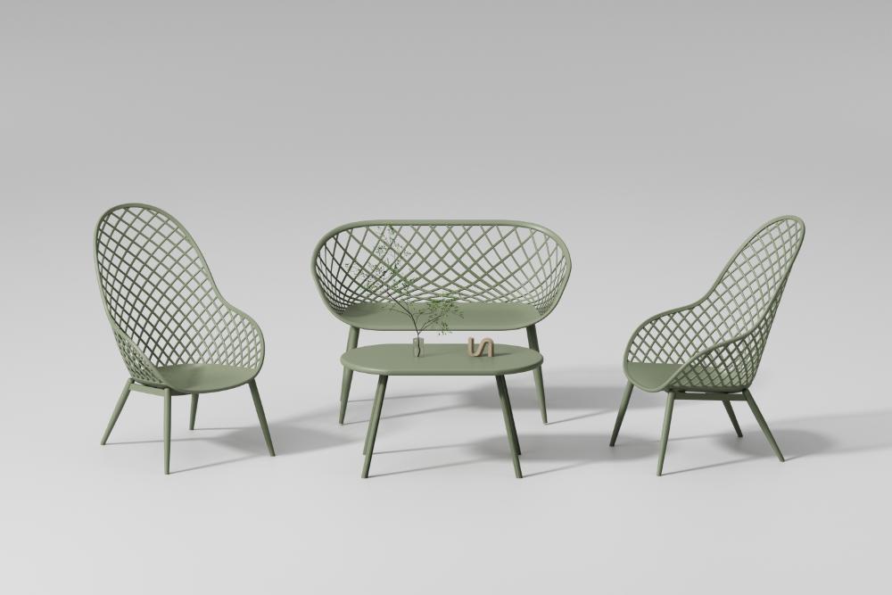 Elaborado en Polipropileno y protección a los rayos UV el set incluye mesa centro, dos sillas y un banco, en Color Verde Olivo