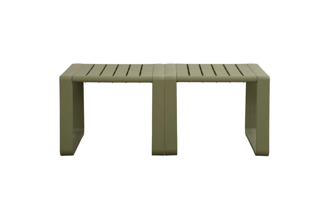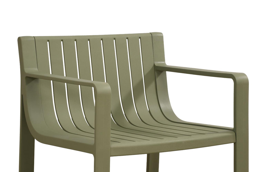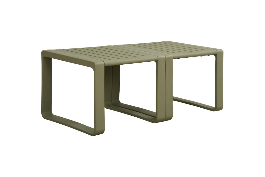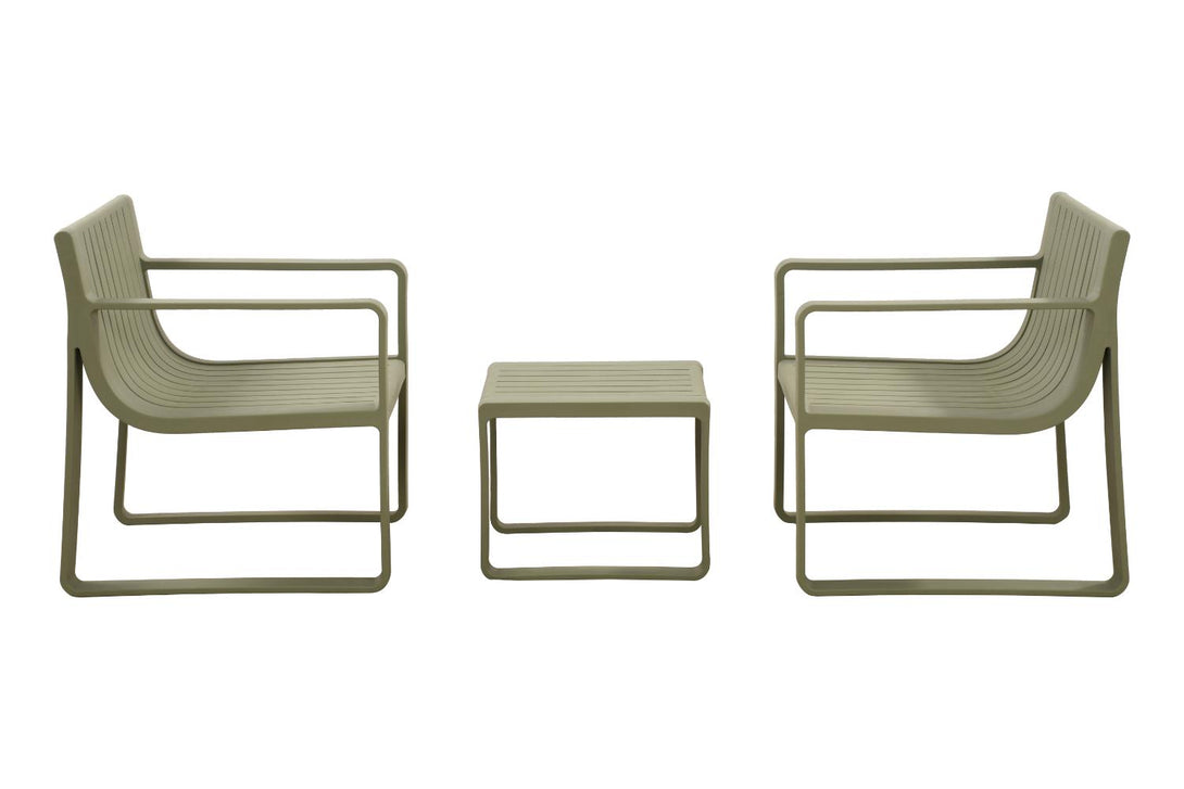 Elaborado en Polipropileno el set incluye mesa centro, dos sillas y un banco, en Color Verde Olivo
